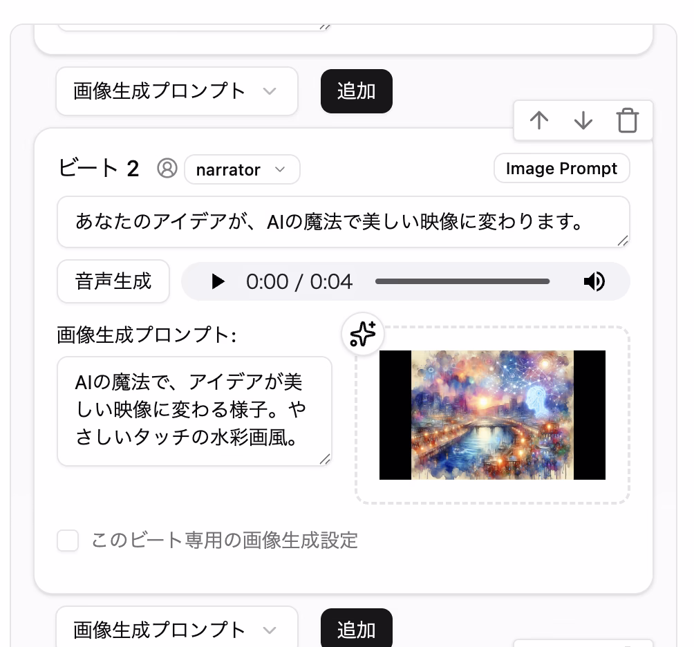 画面中央で、動画の「シーン(ビート)」ごとに、以下を設定: