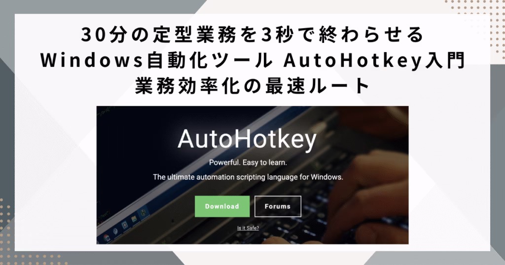 毎日、同じフォルダを開いて、ブラウザを起動して、資料を貼り付けて――そんな「繰り返し作業」に時間を奪われていませんか? 実は、その30分の作業を“3秒”で終わらせることが、Windows環境なら可能です。 フリーで使えるスクリプト言語「AutoHotkey(AHK)...